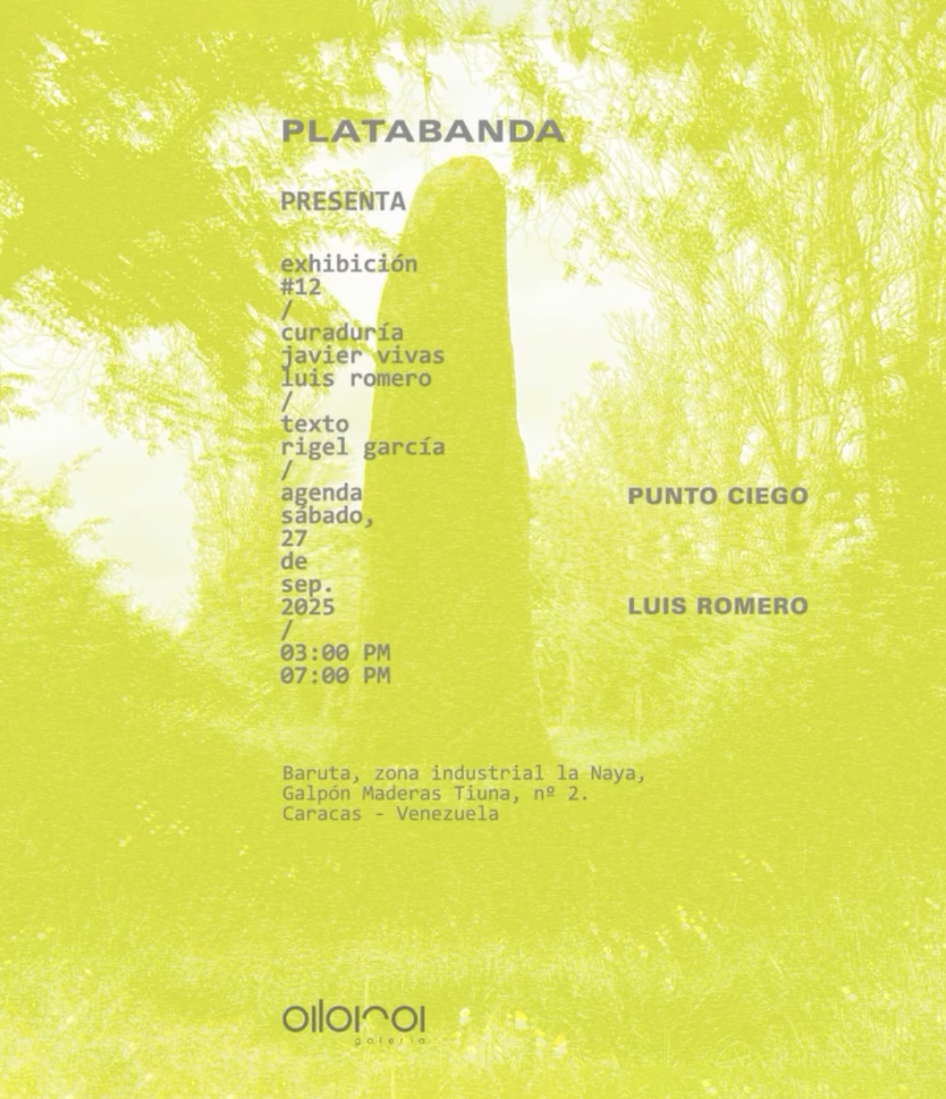 El artista venezolano Luis Romero presenta la muestra Punto Ciego en el espacio de arte contemporáneo PLATABANDA (Caracas, Venezuela). La exposición está abierta al público de jueves a sábado de 2:00 a 6:00pm, o bajo cita previa.